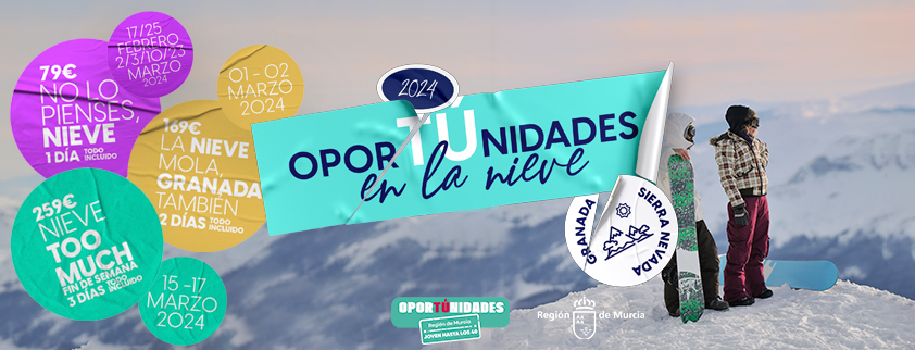 Con este programa, la Consejería de Turismo, Cultura, Juventud y Deportes, a través de la Dirección General de Juventud comienza a ofertar actividades de ocio y tiempo libre para este año 2024; oferta incluida en las medidas del Plan de Juventud presentado el pasado 19 de enero, ofreciendo de esta forma a los jóvenes de la Región de Murcia, de entre 18 y 30 años, la oporTÚnidad de disfrutar de viajes a la estación de Sierra Nevada en Granada.